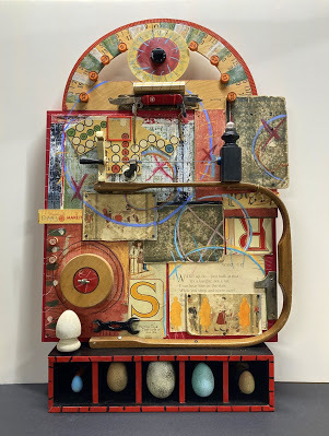 I finished a second piece, Talisman, that ended up being a trip down the rabbit hole back into my childhood family and my own childhood. The eggs at the bottom are my siblings; the five of us, now down to three. There are many childhood references, address numbers, birthdates, toys, moving parts, game pieces, a clock face, a broken Swiss army knife. A whiff of the past that pulsed through my veins into the present, as I let it come out in the work. It's one of my favorite pieces. Value the process.