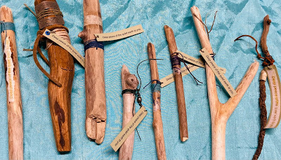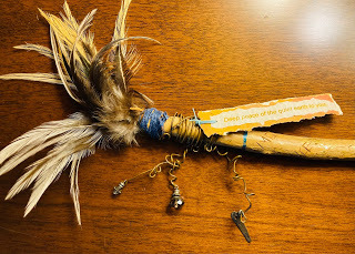 Yesterday, while I was still in the thrall of my bliss, I did my meditation at my studio. After a morning of sorting through my brother's belongings, a parting gift from his former landlord as I left my childhood home to return to my current one, I needed a place to put my feelings of peace and joy and connection. I took with me a stick my brother had started to work into something, the dark one second from the left, along with some deer hide lacing he had wrapped around the stick. Both the stick and lacing reeked of cigarettes that will eventually dissipate, even as they carry the energy of my brother's hands. I put on my new Spotify playlist, and got to work with my drill, the stick beginning to smoke from the friction of the drill bit going deep until it emerged on the other side and I thought of my deep joy. I finished with sand colored waxed linen, carefully wrapping it tightly around the surface, imbuing the beautiful beach stick with my wishes for dear Denny: Deep peace of the quiet earth to you.