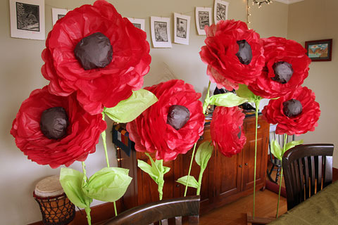 When I was trying to figure out how to construct the poppies, I remembered making little tissue paper flowers in Girl Scouts that we bundled into bouquets and delivered to retirement homes. Would the technique scale up? Yes indeed, and what a wonderful project to inaugurate my beloved new craft room!
