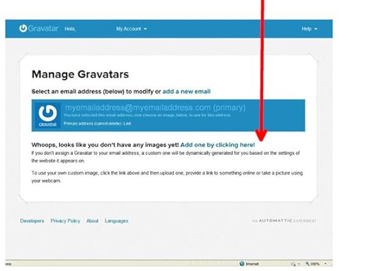 4. After you click “Signup,” the next page looks like this and it’s where you use the email address you’ve entered, or you may add a new one, and you will also see where you can add your image (YES!!!) by just Clicking Here!!! Yippeeeee again!!!