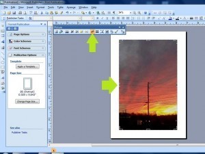 As you can see, this photo is much bigger than the printable area. Publisher has some image editing options. Clicking once on the photo brings up the Picture options tool bar. The next thing you want to click on is the icon that’s eighth from the left (or seventh from the right), which looks kind of like three “X’s” in a diagonal row. This is the “Crop” icon and it will bring up small lines in the corners and on the edges of the image. Both are indicated on the pic below with the green arrows.