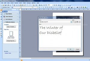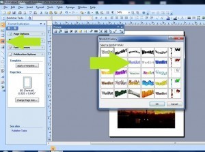Now that we have what will be the background of our cover, it is time to add the lettering for the title. On the far left side bar of the Publisher window, there’s an “A” which is on a slant. Clicking this brings up the WordArt menu. Anyone familiar with Word will know that WordArt is a versatile gadget for doing logos and the like.