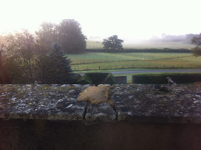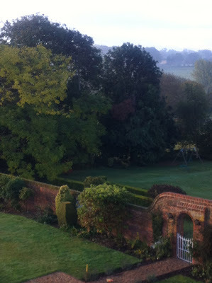 Our B&B, it turns out, is a five minute walk along a back path to Matthew and Diane's house, but today's rain has made it mostly mud--navigable in daylight but risky after dark. Luckily there's also a long way round, only a fifteen minute walk, along the roads. Dinner en famille a great joy, with the three grandchildren, Alice (13) and Joe and Georgia (10) in good form. Returned to the B&B late-ish, in time to watch some commentary on the Vice-Presidential debate. This whole election is proving to be an unwelcome cliff-hanger. Much better to forget about it and to wake, in the morning, to view of the lovely English countryside, taken from our bedroom window...