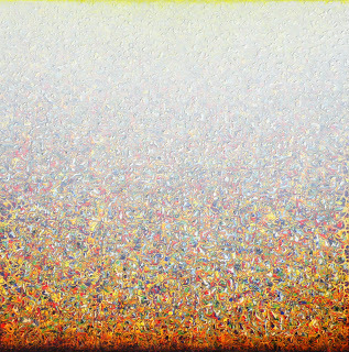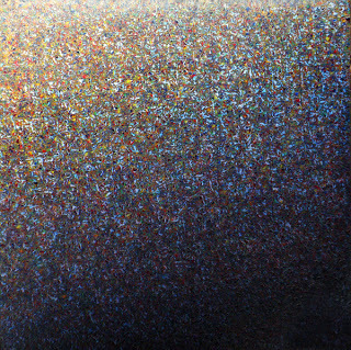 In Bruland’s work we get engaged in both the minutiae and, standing back, in the overall effect—a movement, most frequently, from misty light to darkness in a variety of directions across the surface of the painting. The result can provide the eye with a suggestion of the stability of landscape (as in "Citrinitas," above), or leave us dizzy and off-balance, searching for points of reference in untethered space. It can evoke both the vast reaches of the universe with its countless galaxies and gaseous interstices or, equally well, the restless activity of the subatomic world.