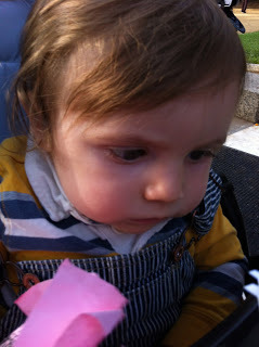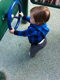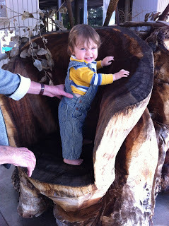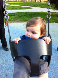 The pleasure was all ours. Saturday we took him first for a long drive. We actually took advantage of his need for a nap to explore the residential hillsides around Silver Lake while he slept in his car seat in the back. Once he woke, we took him to his favorite place for lunch--a small bakery on Los Feliz Boulevard that serves good soups and sandwiches, which has a staff of pretty young women with whom our Luka flirts outrageously. He's now a good-looking lad of thirteen months, with an irresistible smile and an engaging flow of words that only he can understand. He sits in his high chair, bangs his spoon, and scoffs down an amazing amount of not-so baby food: scrambled eggs and apple sauce and, at the end. a few bites of cookie provided by the bakery's owner who had been persuaded by one of the girls to emerge from the kitchen to admire him. After lunch, we took him over to the playground near the Carrousel in Griffith Park, where he played happily on the swings and slides...