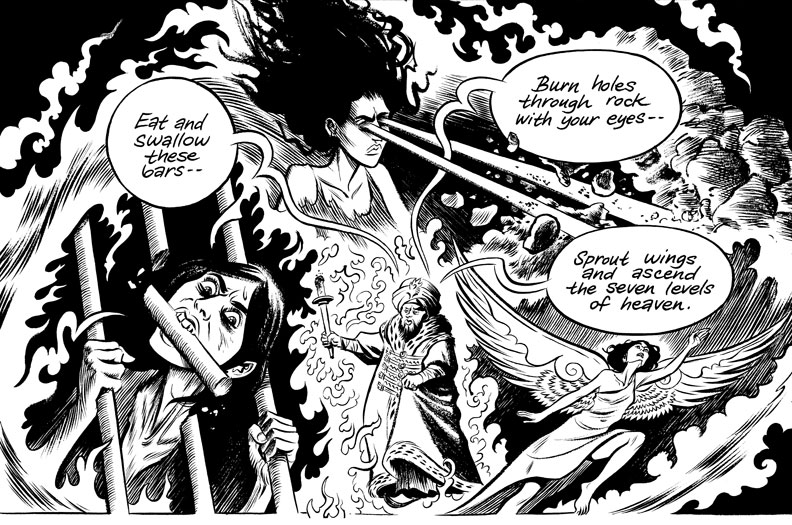 It's just too bad. This book is conceived in a truly spectacular way, and visually, it succeeds and succeeds and succeeds. Even at its most whimsical and farflung, the stories of the prophets and the references to mysticism thread elegantly through the narrative. Thompson has a knack for portraying themes through symbolism in an elaborate, poignant manner.