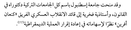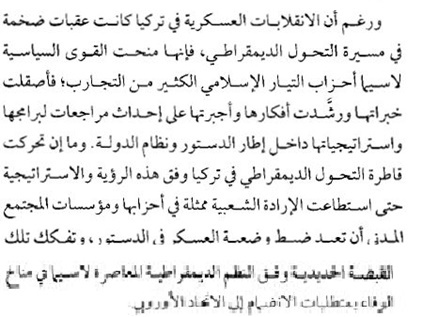 في آخرفقرة في الكتاب توقع - مع الاستبعاد للحدث يعني - بس توقع حدوث انقلاب جديد، رغم وصفه الانقلابات في تركيا بأنها أصبحي في ذمة التاريخ، ولكنه قال طالما الوضعية الأخيرة للجيش، وتوصيفه في الدستور بإنه حامي الدولة التركية، فاحتمالية تدخل الجيش في السياسة والذريعة بتاعته لعمل انقلاب موجوده طالما الدستور متغيرش، والتوقع ده ظهر في بيان الانقلابيين في انقلاب 15 مايو الفاشل بإنهم بيحموا الدولة التركية ومبادئها وهكذا.