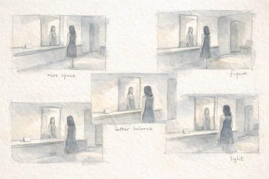 The image in skeletal form, where mirror, figure, border, and negative space first establish the quiet geometry of reassurance shading into loss.