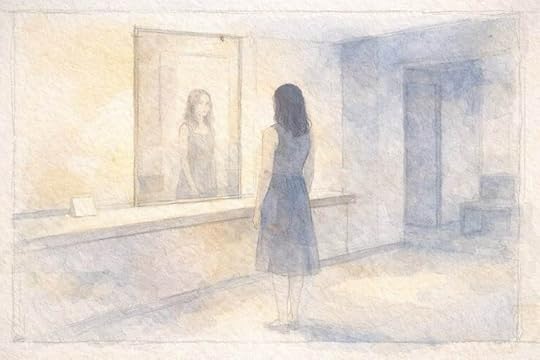 A woman faces her own improved reflection in a room built to reassure, while “My Dear You” quietly asks what polish, correction, and composure may already have rubbed away.