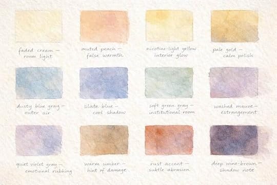A palette study translating the cover’s emotional colors into watercolor terms, balancing institutional warmth against the cooler tones of misrecognition and self-erasure.