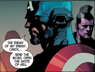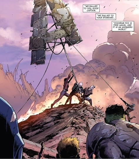 I know, "what do you mean? he leads the charge in several books". But in this book, Cap is actually leading an army in a war for the fate of the world. He's negotiating with races he used to fight against and working with their leaders to lead a charge against the Builders. He's using war strategy, sending negotiators (Thor) and delegates to work together. It's nice to see because, outside of flashbacks to the 40s and Civil War (to an extent) I haven't really seen this side of him.