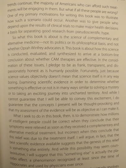 This is part of the prologue, when this doctor says that his book will prove that there is no evidence behind CAM, and that people are just under some kind of spell related to the placebo effect. For some reason this reasoning does not apply to traditional medicine.