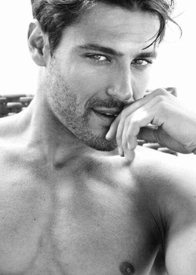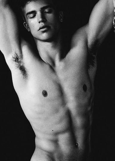 Photo Description: A man looks out from a black-and-white photograph. He is beautiful and shirtless, with a stubble-covered jaw and a hint of what might be a smile. He rests his hand lightly against his chin and cheek. He has clear pale eyes under heavy brows. Lips slightly parted, he studies the one behind the camera with an intimate gaze.