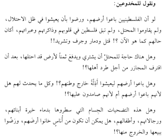 الكتاب توثيقي جيد إلى حد ما, في نفي الأكذوبة الكبيرة اللي تقريباً كنا مصدقينها كلنا عن بيع الشعب الفلسطيني لأرضة . المشكلة أن الكتاب سبب لي حالة من القرف من تاريخ لدول عربية يمكن سحب توصيفها بالعمالة والخيانة وبشدة لصالح وصفها بالغباء والتخلف. يعني إيه مثلا تكون الحركة الصهيونية "اللي هما كانوا كام ألف بني آدم" قدرت تستولى بشكل أو بآخر على 7% فقط من أرض فلسطين وسيادة على 55% طبقا لقرار تقسيم ظالم من الهيئة العامة للأمم المتحدة حتى 15 مايو 1948 (تاريخ إعلان دولة إسرائيل) وتقوم الجيوش العربية بالتصدي لهم , وتهزم بكل بساطة في "نكبة فلسطين " (بالمناسبة كان الجيش المصري معاهم) تقوم الدولة الناشئة اللي أسمها إسرائيل تستولي على 77% من الأراضي بقوانين خاصة بيهم وعادي يعني حصل خير من ساعتها. - ياريتهم العرب كانوا خونة بدل الغباء والتخلف اللي كانوا فيه واللي مازالوا فيه لحد الآن طبعاً وزاد عليهم التبعية والإنبطاح.