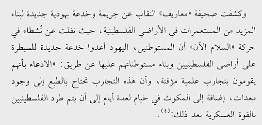 في الإقتباسات بيان لمحتوى الكتاب ، واعتمد الكتاب على الدراسات الغربية والإسرائيلية وهذا أكسبه ميزة كبيرة في معالجته للموضوع لكن الغريب العجيب أن أقوال بعض الصهاينة والمحتلين أكثر إنصافاً من أقوال العرب المتصهينين !!!