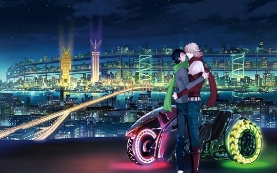Photo Description: Anime-style depiction of two men embracing at night. A brightly lit, futuristic city is their background, as if they stand on a hill. One man is tall and blond, and the other is shorter with dark hair. They seem to have come to this place on the shiny motorcycle beside them.