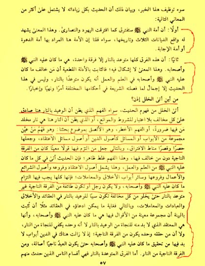 1.النجاة أمر غيبي وأخروي وليس لنا الحق في الحكم عليه ما لم يرد بذلك وحي أو ان يكون من مات ميتا على الكفر الصريح ، بالإضافة إلى التعامل مع الإفتراق على أنه أمر قدري فمجرد حصول الإفتراق ليس عيبا ولا مذمة لا أن يكون الحديث مأسسا للإفتراق .