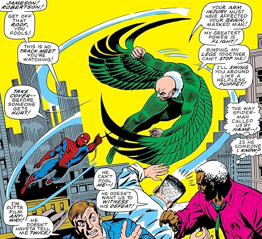 J.JONAH :" Im rooting for the Vulture!" The Vulture battles Spider-Man who has an arm injury over the Daily Bugle building. plus MJ has a new hairdo that makes her look 55! what were they thinking?