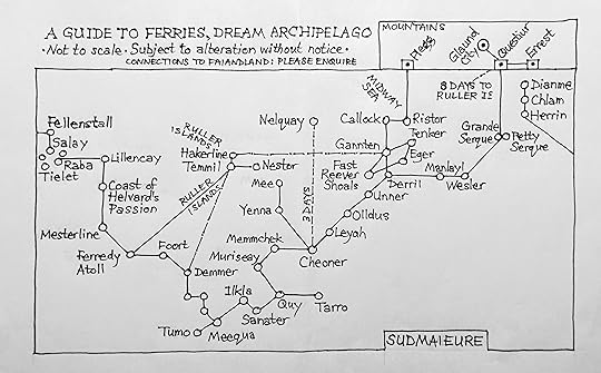 It is though exclusively travel by ferry or cruise ship - there is no sign of air travel, an interesting omission in a world that seems technologically to be equivalent to ours (there are cars, Internet, CD players, plastic). From the geography, vague as it is, this obviously is not 'our 'world, not even an alternate timeline version, but on the other hand it is a recognisably modern society of 'our' kind and indeed at one level the story only works because much of what is alluded exists in our world. For example, at one point it's mentioned that social networking was introduced to Glaund then rapidly banned again, an allusion that only really makes sense in a world where social networking is a reality.