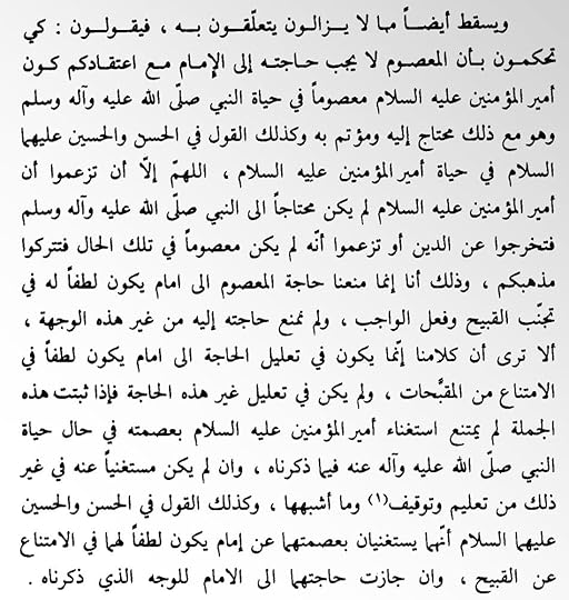 كتاب ألفه الشريف المرتضى ردا على اعتراضات القاضي عبد الجبار المعتزلي على الإمامية في كتابه "المغني" انتهى الجزء الاول: وكان من الاحتجاجات البارزة للقاضي عبد الجبار ما يتعلق بـ: 1-جعل التواتر يحل مكان الإمام فلا تعود الحاجة للإمام، باعتبار أن الشرع منقول بالتواتر، وبين الشريف المرتضى أن التواتر بعضه مغنٍ عن الإمام، والبعض الآخر لا، فمن الوجه الذي لا يغني أحتيج إلى الإمام. 2-وجعل الإمام كالأمير فلا تعود الحاجة إلى الإمام باعتبار أن الأمير يمكن أن يختاره الناس وواقعا هذا الأمر عملي ويسير عليه البشر، وبين الشريف المرتضى أن جواز تعيين الإمام للأمراء ليس دليلا على نفي الحاجة للإمام، ثم فصّل الفرق بين الإمام والأمير.