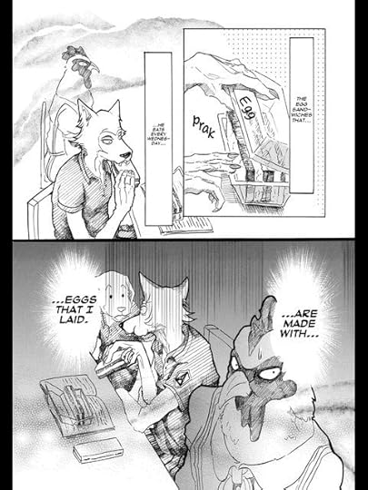 Dude the thing with the hen and her knowing that Legoshi eats her eggs was so bizarre and ridiculous but I absolutely loved it it was so fun. I would die for Juno and I’m intrigued about how her and Legoshis relationship is going to grow and how that might conflict with him and Haru.