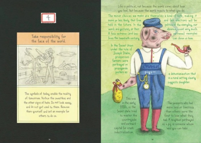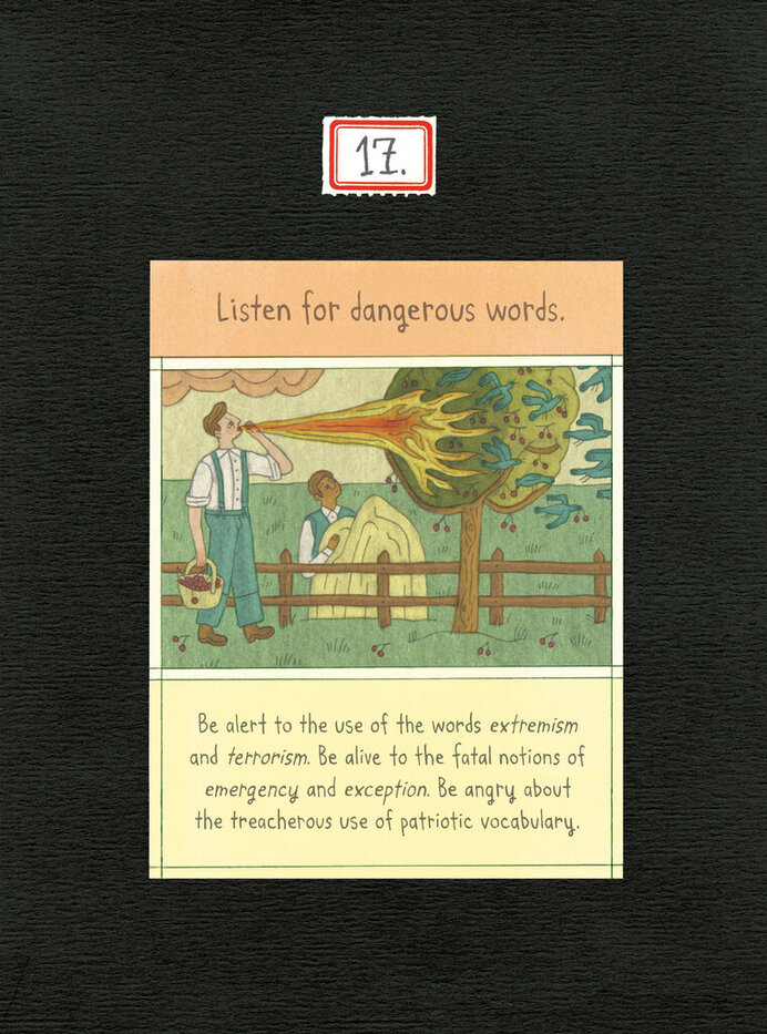 “The mistake is to assume that rulers who came to power through institutions cannot change or destroy those very institutions—even when that is exactly what they have announced that they will do.”The short (128 pages) book is presented as a series of twenty instructions on how to combat the rise of tyranny, such as "Defend institutions", "Remember professional ethics", and "Believe in truth". Published in 2017 as a regular pamphlet, the book got an upgrade in 2021, when the illustrated editions with illustrations by renown artist Nora Krug came out.