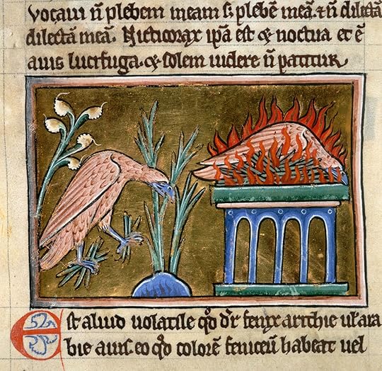 Image: Phoenix plucking at vegetation (left) and lying in flames waiting to be reborn from the ashes (right), 12th-century Latin bestiary. (Source)