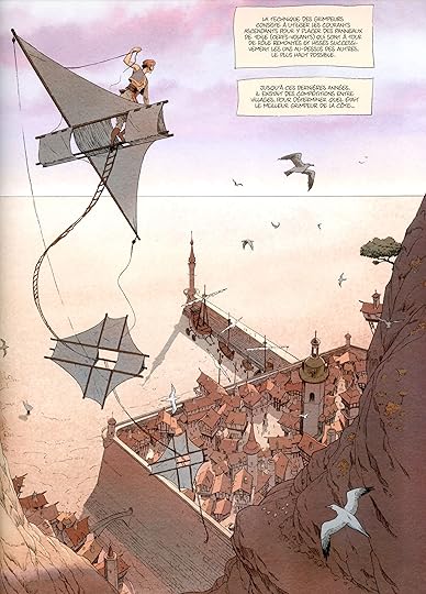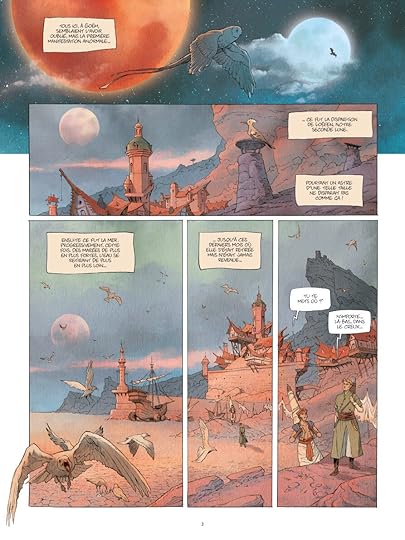 La vie quotidienne de la ville de Goëm est perturbée depuis la disparition de Loëfen la seconde lune de la planète. Puis la mer a commencé à reculer de plus en plus loin lors des marées jusqu’à ne plus revenir et depuis, les habitants sont inquiets. Les deux expéditions parties à la recherche de l’eau ne sont jamais revenues et la survie va devenir problématique si la mer ne revient pas. Pour Niels, un excellent grimpeur, et son frère Vivian, un sondeur hors-pair, malgré les liens qu’ils ont tissé avec deux des femmes de la ville, il est hors de question d’abandonner leur lieu de résidence et ils décident donc de lancer une nouvelle expédition à la recherche de la mer … S’il n’avait pas été sélectionné pour mon club lecture spécial BD de décembre, je pense que je serais passée à côté de cet album. Je ne suis pas particulièrement attirée par la couverture qui m’évoque beaucoup le genre de récit qu’on pouvait découvrir dans les années 1980-1990 et donc assez classique avec un mélange science-fiction tendance fantasy (dans le style Les eaux de Mortelune). Je connais d’ailleurs le scénariste avec sa série Les écluses du ciel, que j’ai lue il y a bien longtemps (j’avais plutôt bien aimé d’ailleurs mais depuis, mes goûts ont un peu changé). Je suis donc partie un peu à reculons dans cette lecture qui plonge le lecteur directement dans un monde lointain, où une planète à deux lunes mais au final assez similaire à la Terre, a vu disparaitre ses mers … enfin, au moins celle qui concerne la ville de Goëm, où nos héros vivent. Les choses sont quand même subtilement différentes par rapport à notre planète : les plantes ont des noms similaires à celles qu’on connait, les noms des points cardinaux sont eux aussi légèrement modifiés (North ou Houest par exemple) et le paysage parait bien sec vu que la mer a disparu, provoquant aussi la raréfaction des pluies. Le graphisme est donc à l’avenant : les couleurs sont solaires mais douces et le trait est tout en finesse. Les décors sont bien réussis et les personnages assez classiques et bien typés, même si certaines de leurs occupations le sont moins. Vivian est sondeur : il plante des tubes dans le sol pour y détecter l’humidité et il n’y a rien d’étonnant là-dedans. Mais Niels est grimpeur : il se hisse le long d’échelles qui relient des sortes d’énormes cerfs-volants qu’il déploie de façon à aller de plus en plus haut et bien observer l’horizon à la recherche de l’eau. Cette activité est nettement plus surprenante et m’a beaucoup plu. Sinon, l’ambiance générale évoque un monde un peu hors du temps, mélange de passé et de futur : les bateaux sont à voile, comme dans les années 1500-1600 mais sont équipées de roues vu qu’il n’y a plus la mer pour les porter. A noter la présence d’un perroquet à mi-chemin entre l’oiseau et le robot, que j’ai forcément beaucoup aimé. Le récit sera essentiellement la quête de cette eau aux confins de cette planète avec des aventures en chemin et une conclusion un peu inattendue sous certains aspects. Au final, malgré mes réticences, je me suis laissée entrainer aux côtés de Niels et Vivian avec plaisir !