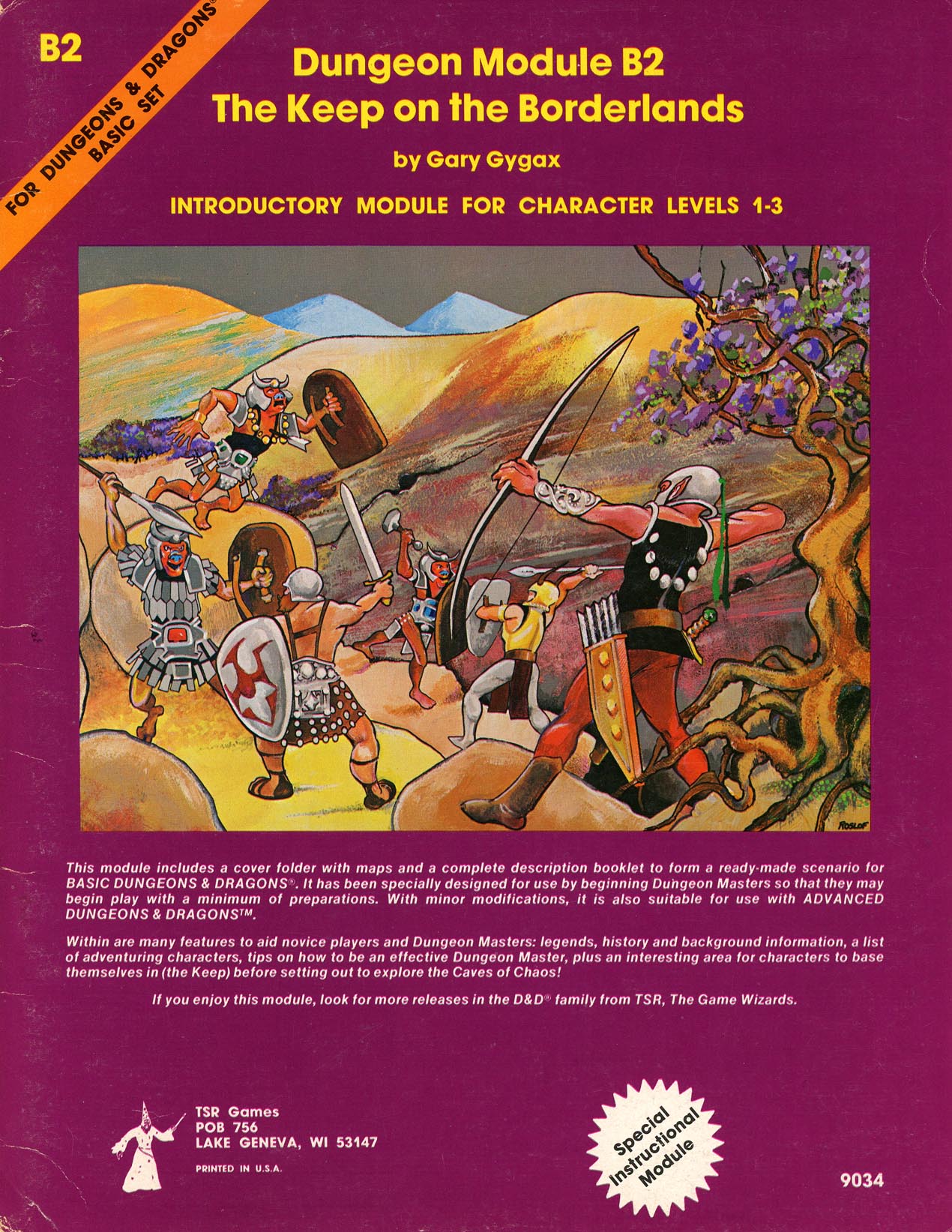 "B2: The Keep on the Borderlands" (1979), by Gary Gygax, was printed by TSR in December 1979. It was probably TSR's twelfth adventure, and the first one to use a full-color cover. . . . Like its predecessor, B1: In Search of the Unknown, this adventure was created for use with the first edition of the Dungeons & Dragons Basic Set (1977), created by J. Eric Holmes. Once it was printed, "Keep on the Borderlands" immediately replaced In Search of the Unknown in the Basic boxed set.However, "Keep" is much better known as the adventure packaged with the second edition Dungeons & Dragons Basic Set (1981), which was revised and updated by Tom Moldvay. It remained a part of that package throughout its life (1981-1983).From 1980-1983, Dungeons & Dragons was seeing its most explosive growth, and the Basic Set was the prime entry point to that game. As a result, B2 ended up the most printed D&D module of all time. Much later estimates suggest there might have been 1.5 million copies printed in all, between the two boxed sets and standalone sales."The Keep on the Borderlands" has been revisited many times, most notably in Wizards of the Coast's Return to the Keep on the Borderlands (1999) for AD&D. In more recent years, the setting made a thematic return as the Chaos Scar, which was spotlighted in D&D Encounters Season 3: Keep on the Borderlands - Season of Serpents (2010-2011) and in Dungeon #171 (October 2009) through Dungeon #197 (December 2011), all for 4e. The adventure may still have a future in D&D too, as it was released as Caves of Chaos at D&D Expo 2012 as a playtest for D&D Next.About the Creators. Gary Gygax wrote The Keep on the Borderlands at the end of his period of greatest adventure productivity, from 1977-1979, shortly after creating T1: The Village of Hommlet. By this time, actually managing TSR was taking up increasing amounts of his time, which kept Gygax from doing more creative work. He hired Jean Wells and Lawrence Schick to form a Design department in 1979. Going forward, this department would be the main source of TSR's adventures, not Gygax." Five stars. Succeeds as a basic D&D primer and launch mechanism. In conclusion: "You know that you have certainly discovered the Caves Of Chaos." Bree-yark!