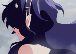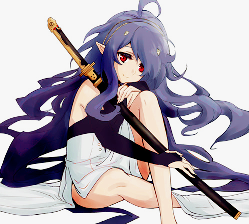 Asura stands at a short height of 5’0” with a fitting and slender build and appears as androgynous adolescent male. He has long wavy hair colored a dark shade of purple reaching to his ankles, with his bangs covering half of his face and large red eyes rimmed by long, dark eyelashes. The boy is often reminiscent to a child due to his small stature and physique, despite his actual age which is currently unknown. On the edge of his hairline, he has two small golden and pointed horns protruding from his skull and elongated pointed ears peeking out of the sides through his hair. He has long sharp fangs within his mouth that can seen when he smiles, which is seen often. Asuramaru wears a headband composed of two parallel golden strips that match the horns on his head and a sleeveless long dress. The dress is open at the back with the chest area being black and a black collar with golden studs embedded in it stationed around his neck. The rest of the gown is white with a slit on the side of his right thigh, freeing his legs for easier movement. Long sleeves adorn his arms which are not attached to the dress and reach down to is middle finger with a golden ring around it to keep it tight. His eyes are a dark shade of red, like garnet, with a slit cat-like pupil in the center, proof of his dragon blood. The boy has a smooth and pale complexion. He usually smells of lavender or lilacs.