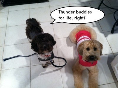 As I’m typing this, we’re having a HUGE STORM and the dogs are NOT happy. They’re in their Thundershirts (do they work? they can’t hurt!). Bailey can use anything to ease her stress. Brady likes anything Bailey does. So here’s a pic to make you laugh. As long as I’m in the house, I’m fine. I hate being out in the rain!