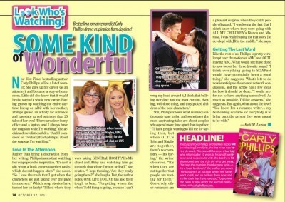So in my vocalness, (is that a word? Don't think so) I caught the attention of a Soap Digest editor, Mala Bhattacharjee, who asked if I'd write up something about my feelings on the matter. If you missed it, the article, ABC Daytime jilts Carly Phillips ran in April 2011. I was and am ridiculously proud of getting onto Soap Digest online, in fact it's been one of the highlights of my career. In case you don't know, my Kelly Ripa Fairy Godmother moment was the main moment and not just because she chose my book, but because I got to meet Hayley Vaughn, her All My Children Character. I do have my priorities, people!