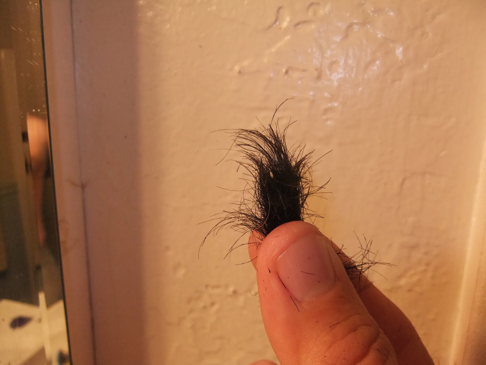 Well, the time has come. For the last few days, I’ve stepped out of the shower to find my neck matted with hair. Yesterday, all that hair loss became--at least to me--noticeable; I looked like I’d had a haircut. This morning, I could gently pinch the hair on my head and come away with this: