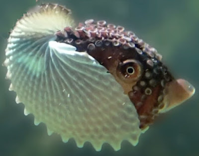 Then there's the other one--the Argonaut (Argonauta argo), a fabulous creature that also creates a very thin, papery shell that it uses to move up and down in the water column... but only the females do so. They are not attached to the body of the female. But, oddly, they make the shell by extruding it from their body and then holding onto it for the rest of their lives.