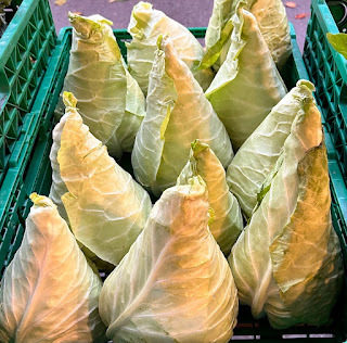 Which rapidly told me that this cabbage has a number of names: conehead, pointed, arrowhead, and sweetheart cabbage. It's described as having "... leaves, with variations of pea green colorings, are thin, broad, deeply veined, tightly enveloped lengthwise and bluntly pointed. The flavor of Conehead cabbage is mild and remarkably sweet, void of that bold cruciferous flavor that is most reminiscent of cabbage."