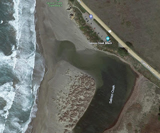 In the top image, the Gualala River is blocked from running freely to the sea by an accumulation of sand. The water is a beautiful blue, and forms a fairly large lake behind the barrier.
