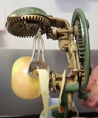 Ramón points us to this amazing video of an 1870's peeler being restored and used. Which reminded me to search on YouTube for a Sargent and Foster apple peeler video in use.