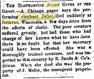 But in #2, Romeo and Juliet, we read that Juliet died one winter on the shores of Lake Delavan and was then pulled out onto the ice of the lake by Romeo, possibly explaining why he turned mean. This page goes on to say that "fishermen still pull elephant bones out of Lake Delavan..."