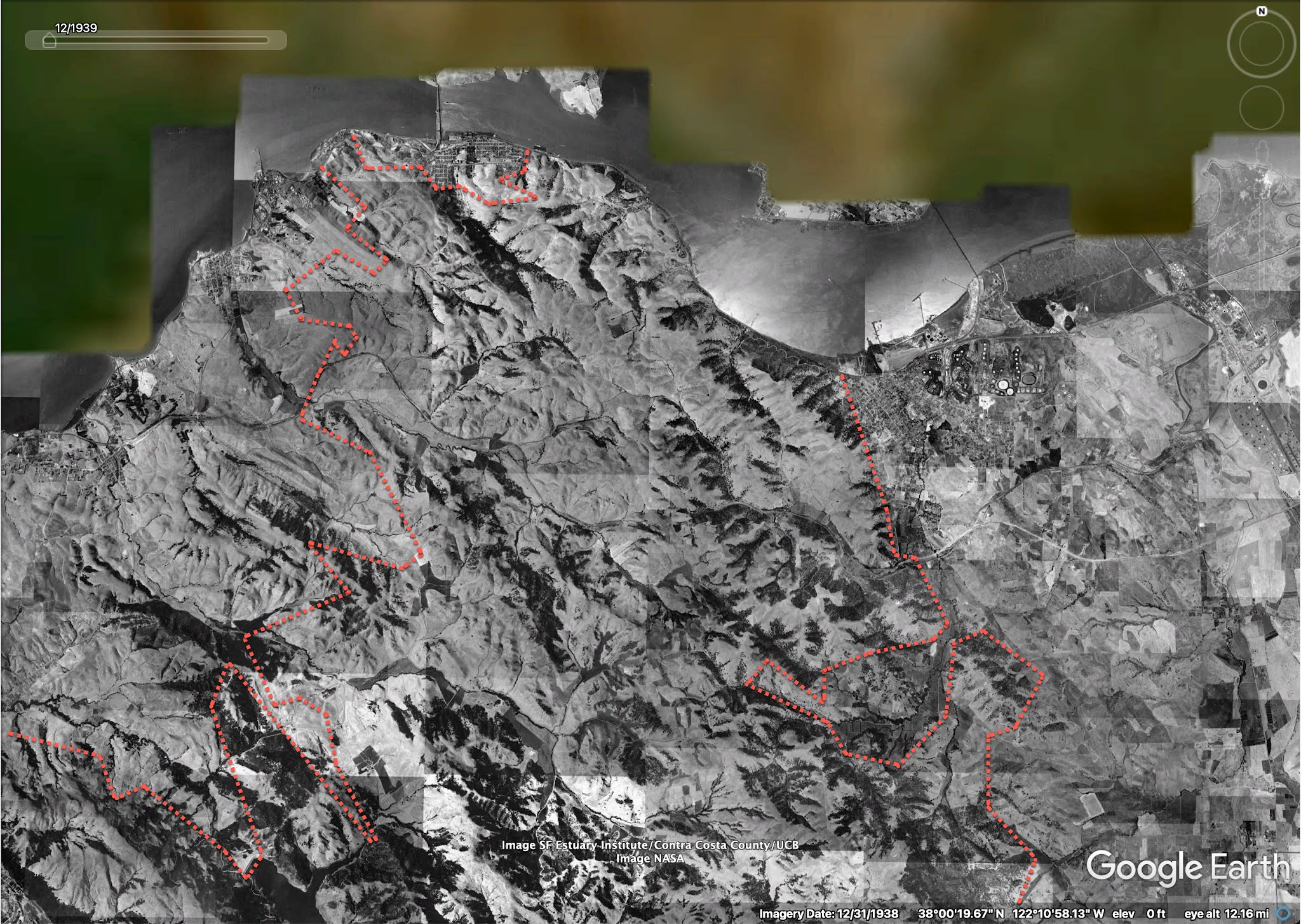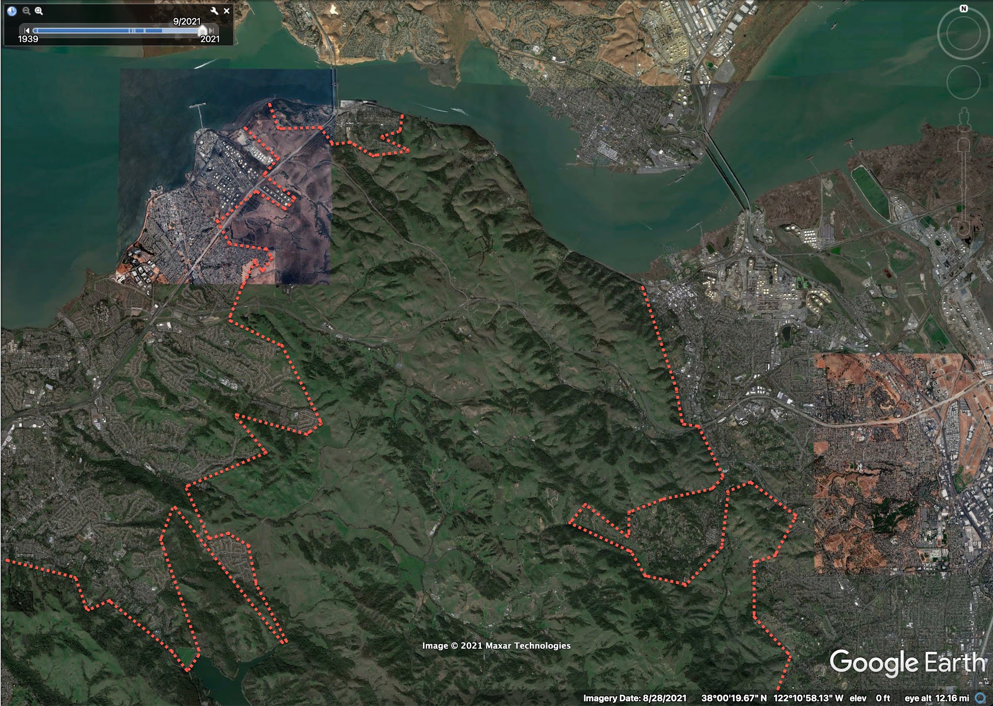 I noticed that while there's a lot of development (houses, shopping centers, etc.) on the north side of the strait, there's very little on the south side. So... why is there such a big gap between Crockett and Martinez, a large region of undeveloped land. Let me repeat this week's Challenge: