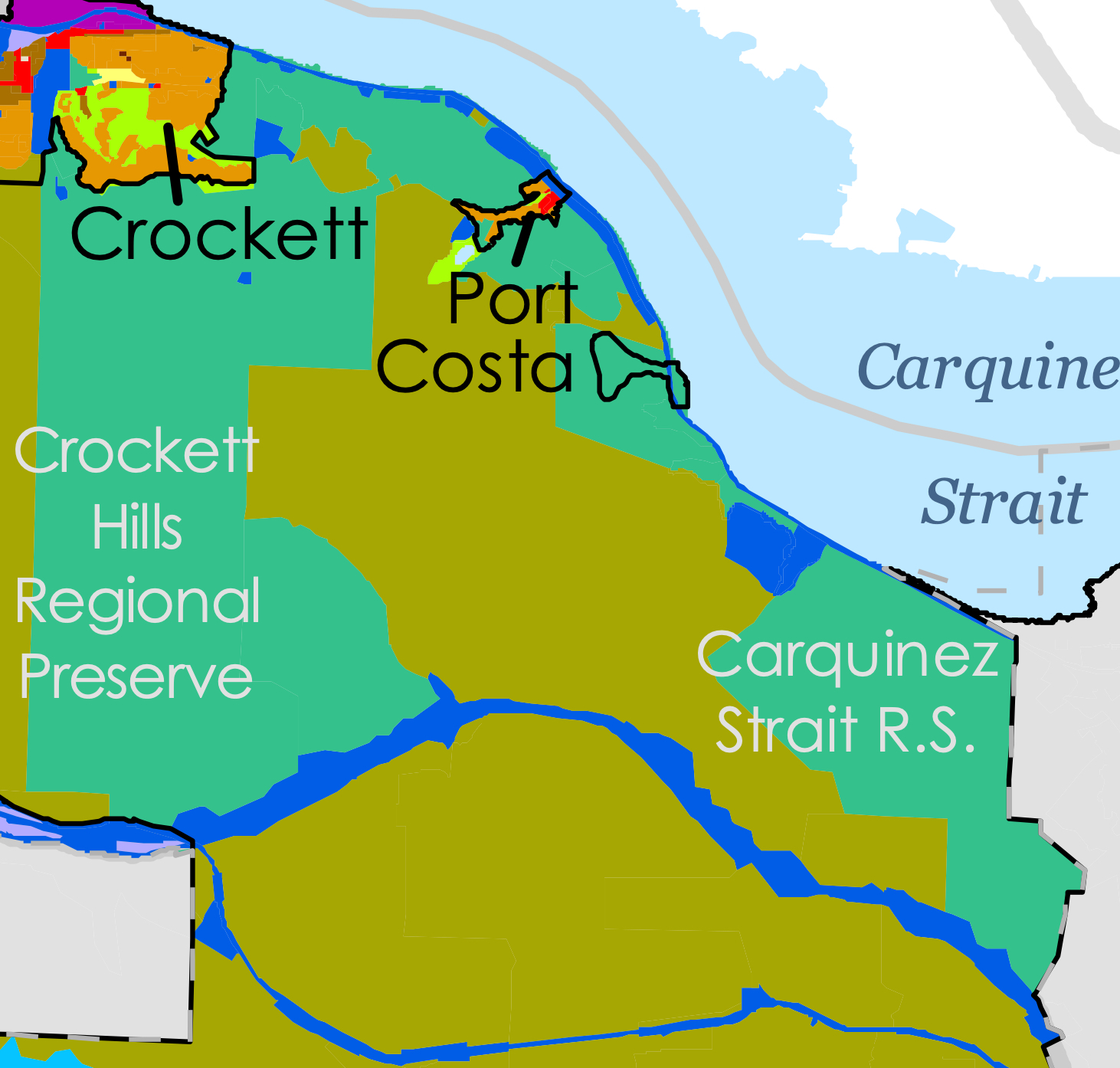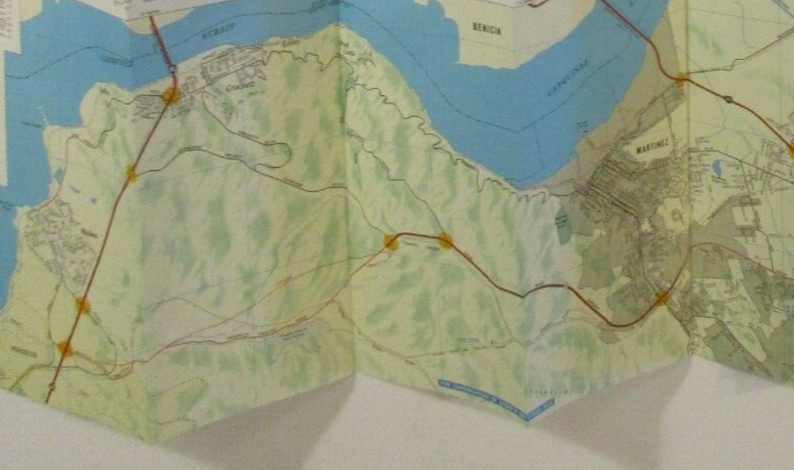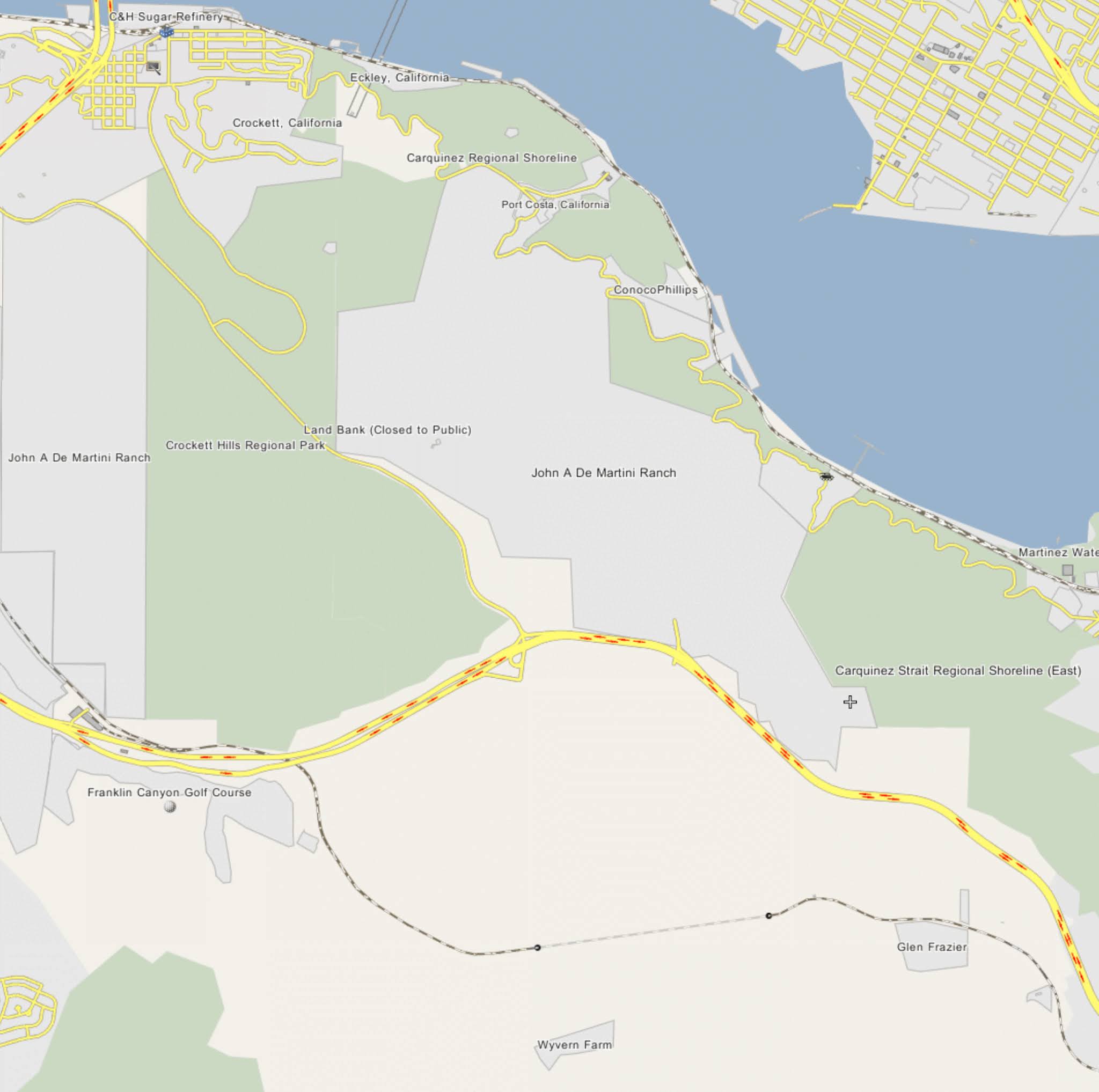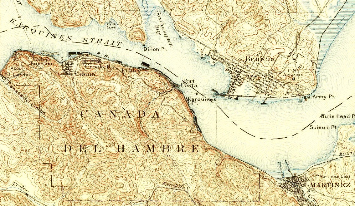 Here, a couple of place names leap to the fore: "Port Costa" "Crockett Hills" (a regional park), and "Carquinez Straits" (another regional park), "Martinez." If you zoom in a bit more, you'll also see "Bull Valley" and "Eckley" as other place names of interest.