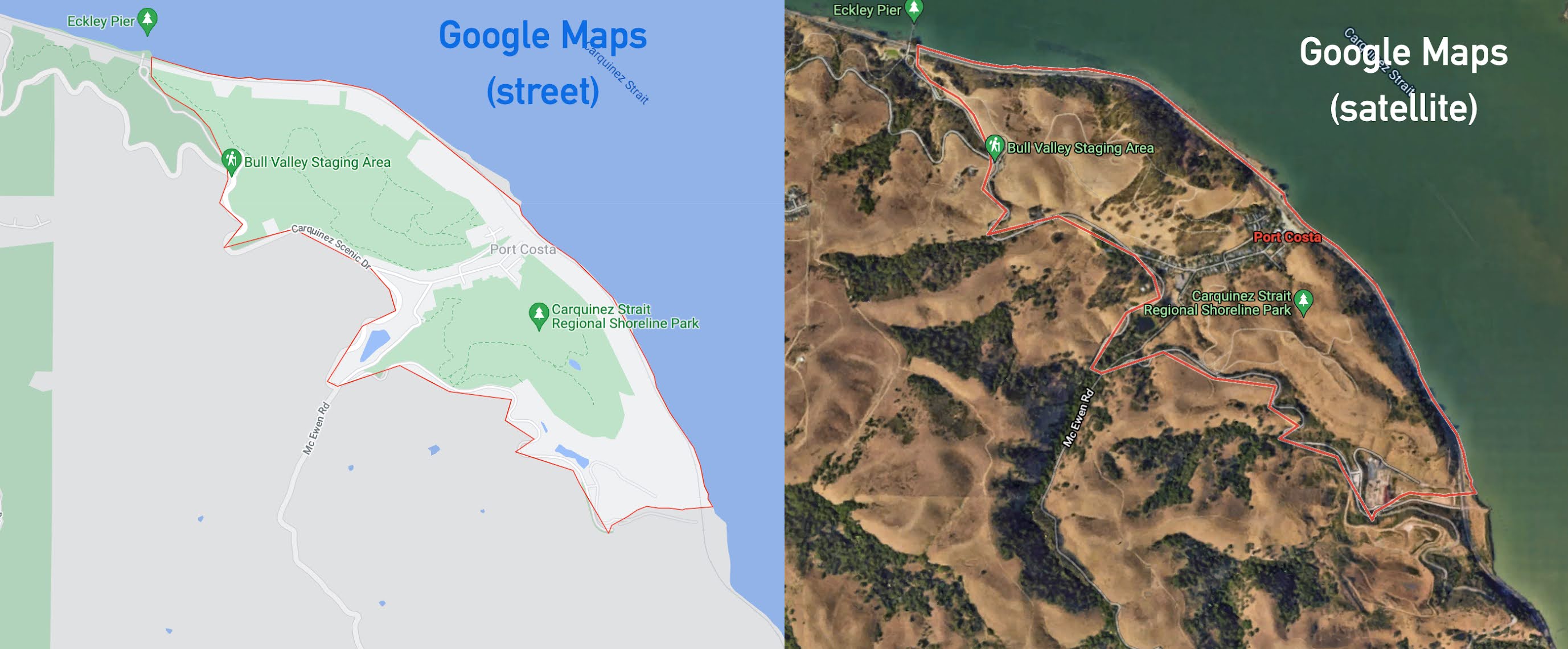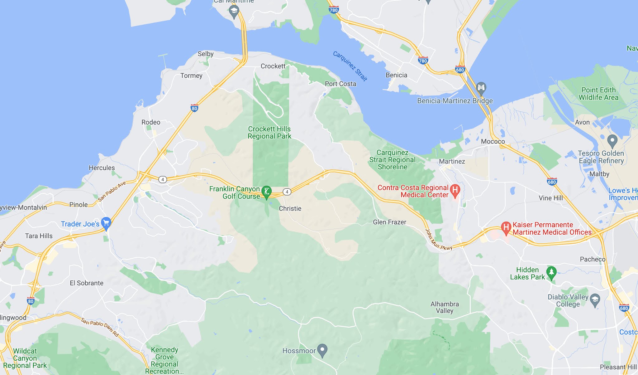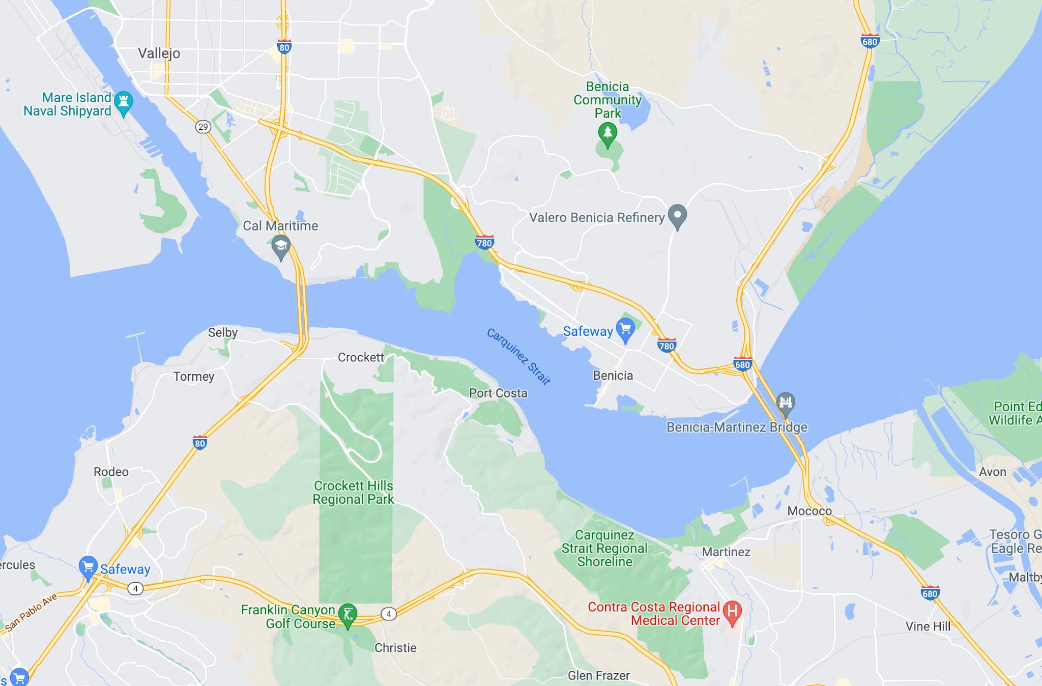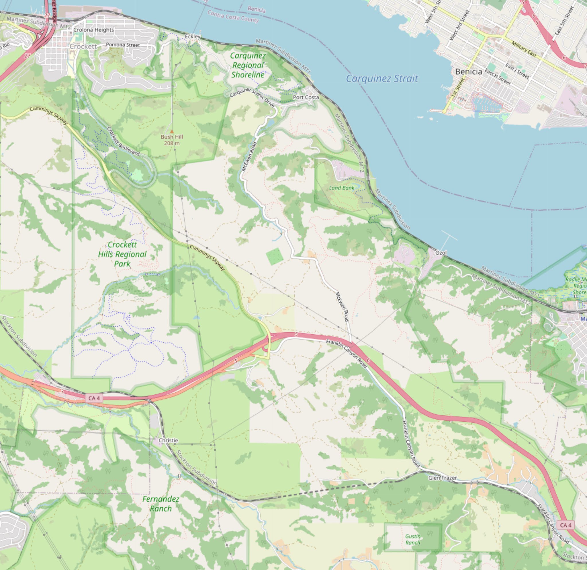 Here, a couple of place names leap to the fore: "Port Costa" "Crockett Hills" (a regional park), and "Carquinez Straits" (another regional park), "Martinez." If you zoom in a bit more, you'll also see "Bull Valley" and "Eckley" as other place names of interest.