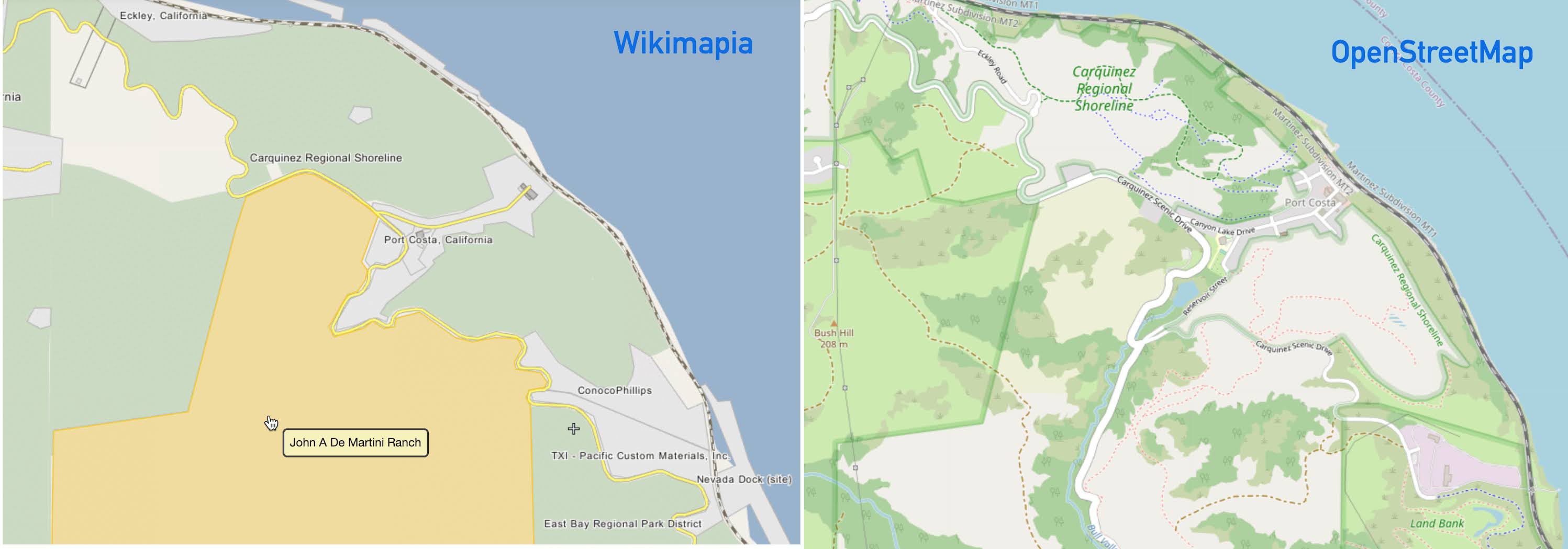 As you can see, they have very different views on what's going on the old Rancho. The Crockett Hills Regional Park is the same, but the De Martini Ranch isn't marked on the OSM plan. And, as you can see, the bulk of the Rancho is either Di Martini ranchland, or preserves.