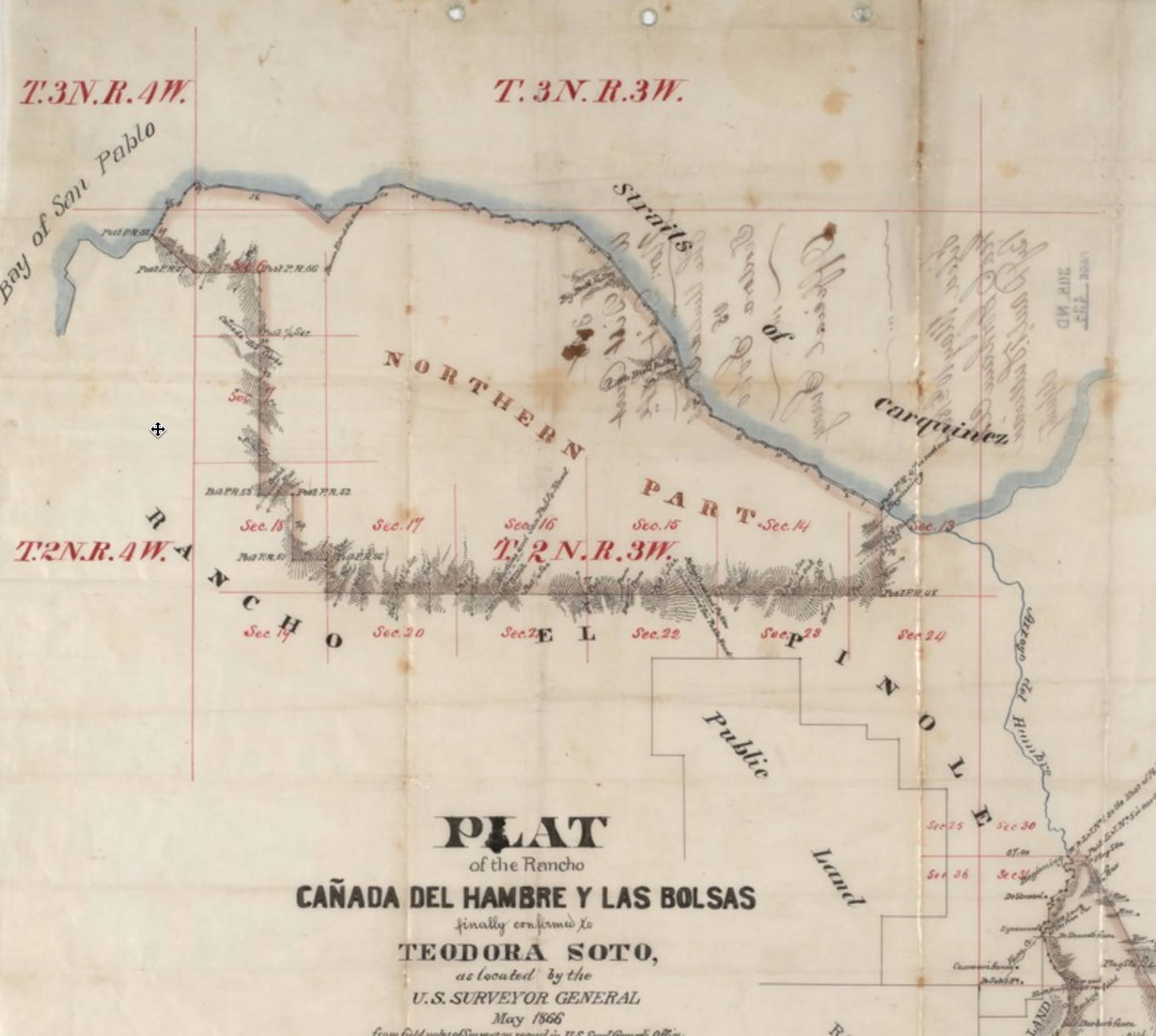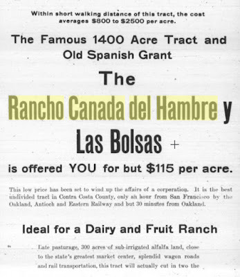 My first dive was to figure out who owns this part of California. My dive research told me that this area was called Rancho Cañada del Hambre y las Bolsas. (I found this out after seeing several maps from the late 1800s with that as the place name... see below.) The ranch was a 13,354-acre (54.04 km2) Mexican land grant that was given in 1842 by Governor Juan Alvarado to Teodora Soto. The grant consisted of "Cañada del Hambre" which means "Valley of Hunger" in Spanish, and "Las Bolsas del Hambre" which refers to "pockets" of land.