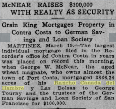 Of course, I did a search for the history of Ranch Cañada del Hambre, and found a Wikipedia article, this told me that the grant for the rancho made to Teodora Soto was "sobrante," (that is, a remainder after the Rancho El Pinole on the west and the Rancho Las Juntas on the east were sold). It was estimated that the sobrante would contain three square leagues of land. (If you ask Google [ 3 square leagues of land in acres ] you'll find that it's 22,000 acres, Teodora Soto was married to Desiderio Briones. (Now that's interesting... Why? Because the grant was made to a woman, which wasn't much done at the time, AND we've seen that name, Briones, before. Desiderio was the nephew of Juana Briones, who owned land in San Francisco at this time. See SRS from March 8, 2018-- "How did this group of houses get to be here?" Two powerful Californio women who end up related to each other?)