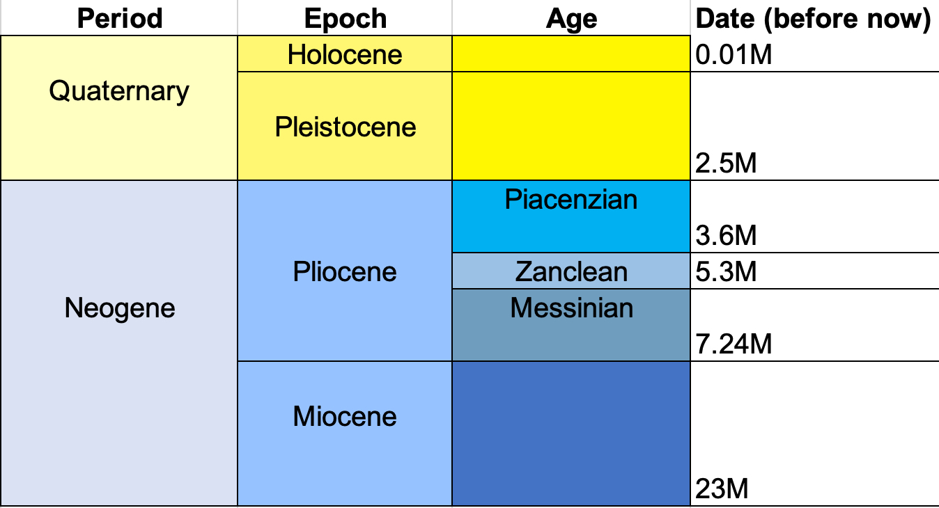 Here's a chart for reference. The USGS paper only covers the Quaternary (that is, the Holocene and the Pleistocene).
