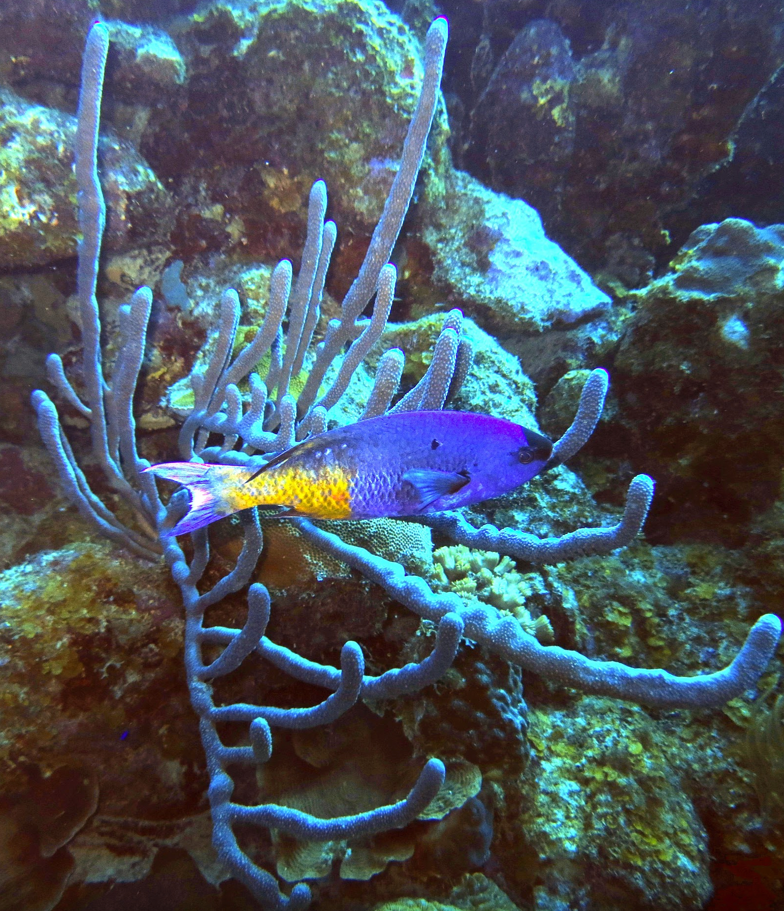 Look at the images if you search for images of Clepticus parrae – it’s mostly blue fish. But they change a lot over time. The above image (mostly blue with a yellow tail) is common, but so are entirely blue fish. – or look at the variety of colors and patterns on the ReefGuide site. This is common among reef fish—very different appearances at different parts of life. An article from the University of the West Indies about the life of Creole wrasses points this out: "During the initial phase the creole wrasse is purple/blue in colour, and upon reaching the terminal phase they appear purple. Larger individuals display a wash of yellow on the lower two thirds of the body..."