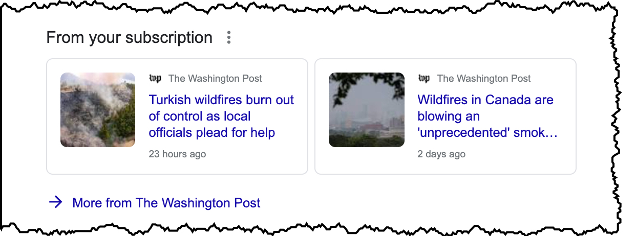 You can see I've subscribed to the Washington Post--and for this query [wildfires]--I'm seeing links to articles from my subscription.
