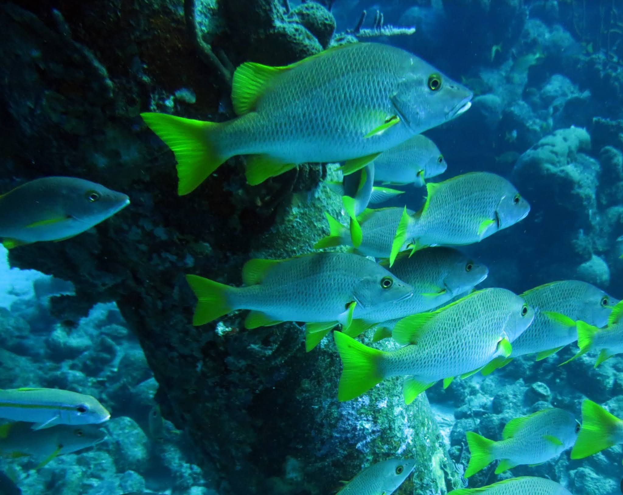 The top fish is a Schoolmaster snapper (Lutjanus apodus) – yellow fins, medium size, the vertical bars are absent in older adults (see also the Wikipedia entry for L. apodus).