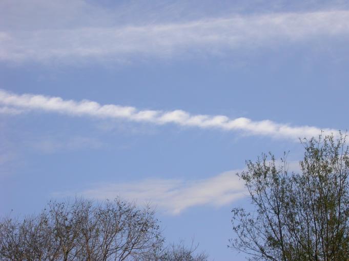 Regular Reader Jon (the Unknown) points us to Crow Vortex instability (or the Wikipedia article) as another mechanism for making pulses in contrails. It happens when the wingtip vortices interact with the engine contrails, producing visible distortions in the shape of the engine contrails.