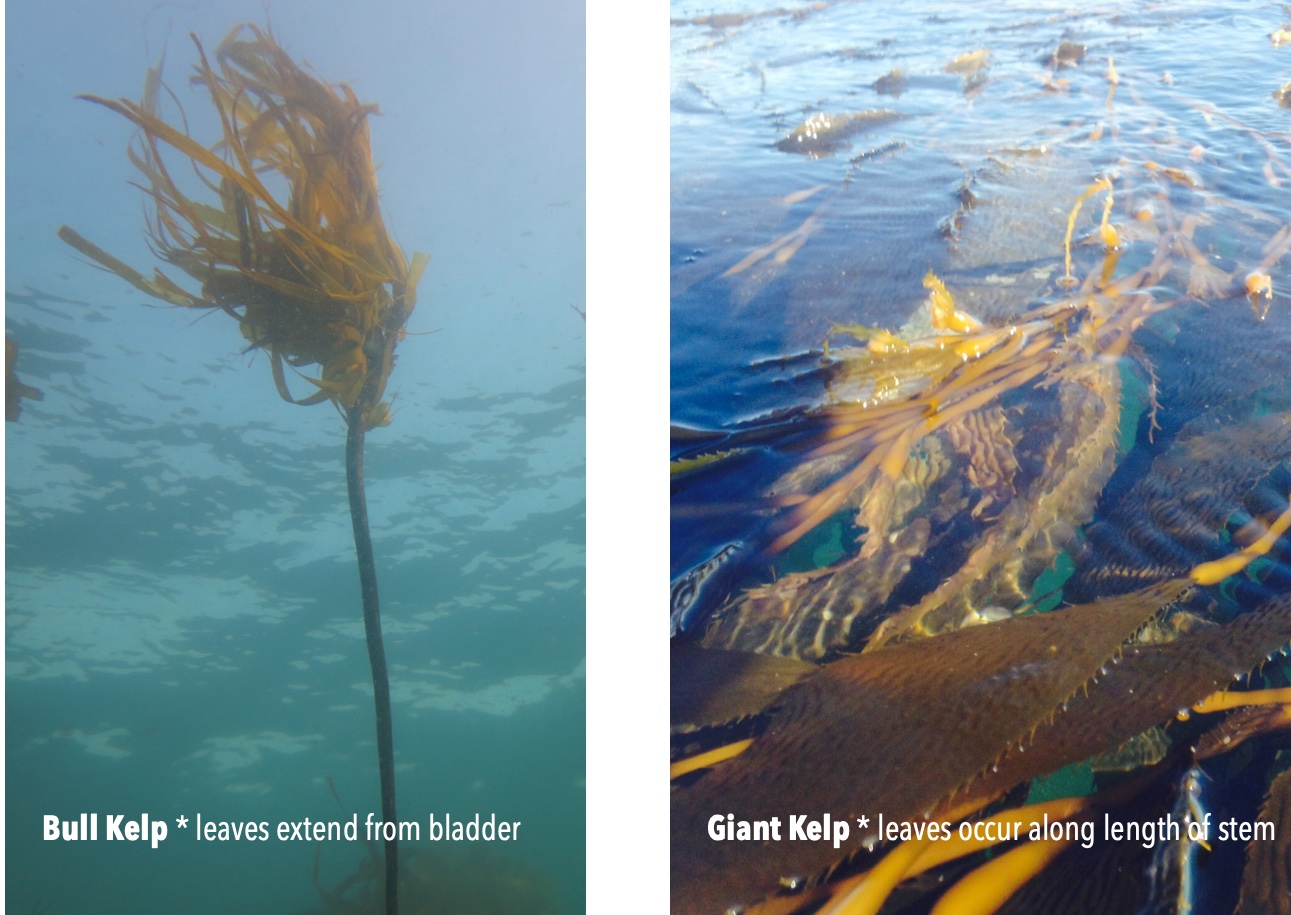 For this Challenge we're interested only in kelp that grows along the California coast. And there are really two dominant kinds: bull kelp (Nereocystis luetkeana) and giant kelp (Macrocystis pyrifera). Here they are side-by-side for comparison. They look very different, but both colonize Californian waters.